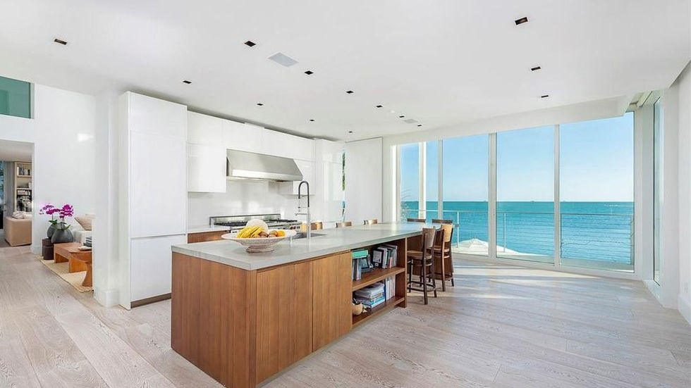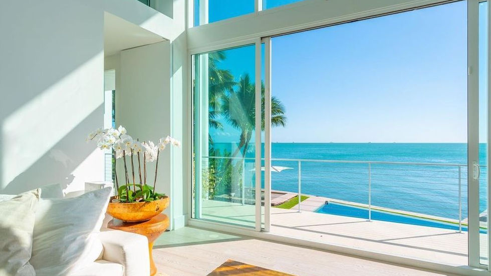 This contemporary modern vacation house is located in one of Florida's most prestigious islands, several miles away from Miami. Concrete white structural elements and large window casements, the house has a built-up area of 760 square meters spread on 3 floors and a rooftop, and it has a huge yard with an infinity pool, which 'spills' into the sea. The house has 5.5 bedrooms with en-suite bathrooms, two family rooms, a living room, a maids headquarters, a gym, a study and a library/guest room on the roof. All rooms have ocean views. The house has its own attached boat dock.